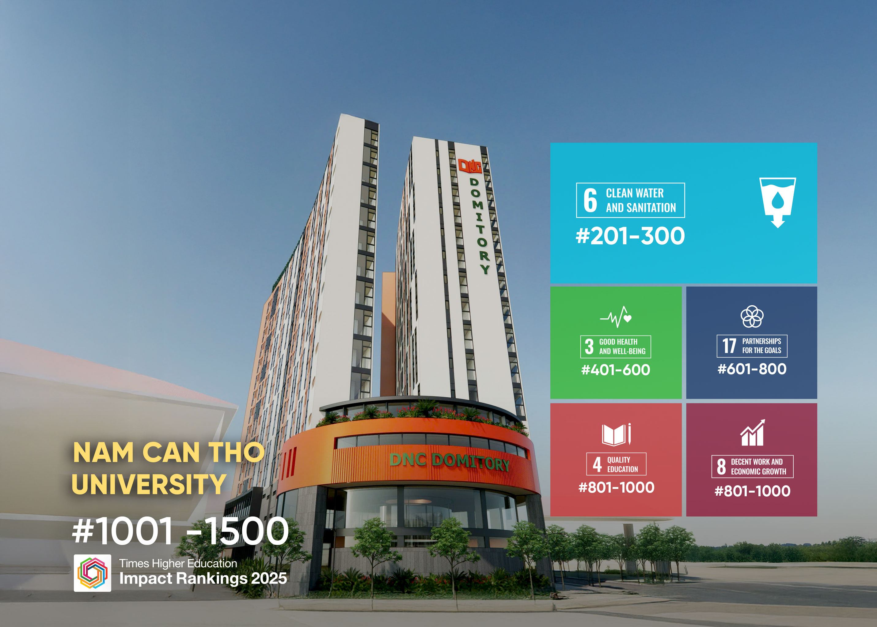Nam Can Tho University (DNC) is proud to announce: For the first time in its history, the university has officially been ranked among the Top 16 Vietnamese universities recognized in the prestigious Times Higher Education (THE) Impact Rankings 2025.