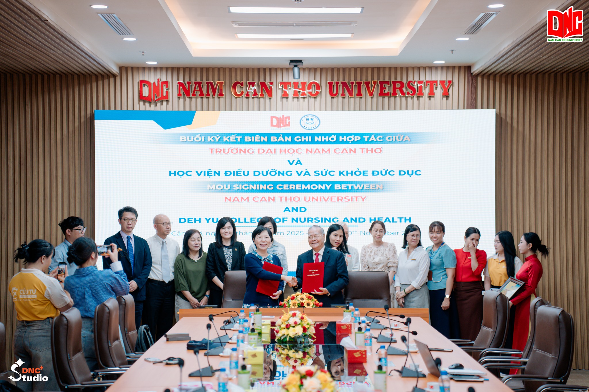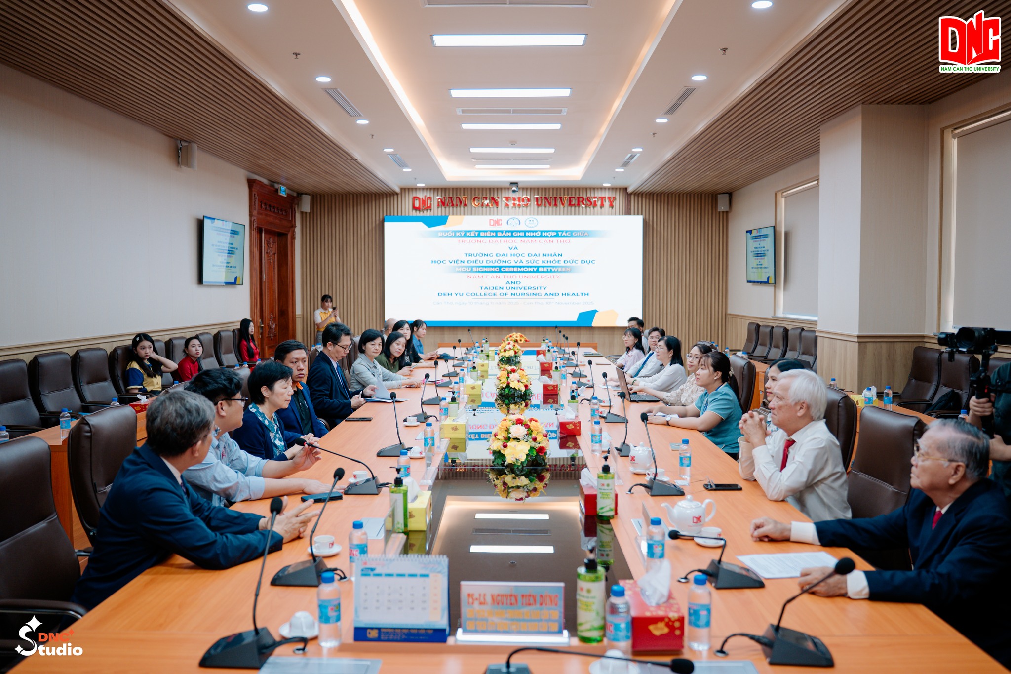 DNC - Sáng ngày 10/11/2025, tại Phòng họp Yersin, Viện Khoa học Sức khỏe, Trường Đại học Nam Cần Thơ (DNC) đã long trọng tổ chức chương trình ký kết Biên bản ghi nhớ hợp tác (MOU) với Học viện Điều dưỡng và Sức khỏe Đức Dục, Đài Loan. Sự kiện đánh dấu bước phát triển quan trọng trong chiến lược hợp tác quốc tế của DNC, mở ra cơ hội hợp tác toàn diện trong đào tạo, nghiên cứu khoa học và phát triển nguồn nhân lực chất lượng cao.