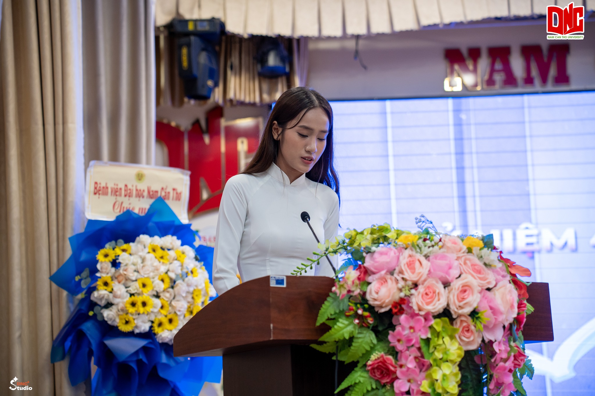 Sinh viên Trương Uyên Nhi - Hoa khôi Miss DNC 2025 đại diện sinh viên phát biểu tại buổi họp mặt mừng 43 năm Ngày Nhà giáo Việt Nam